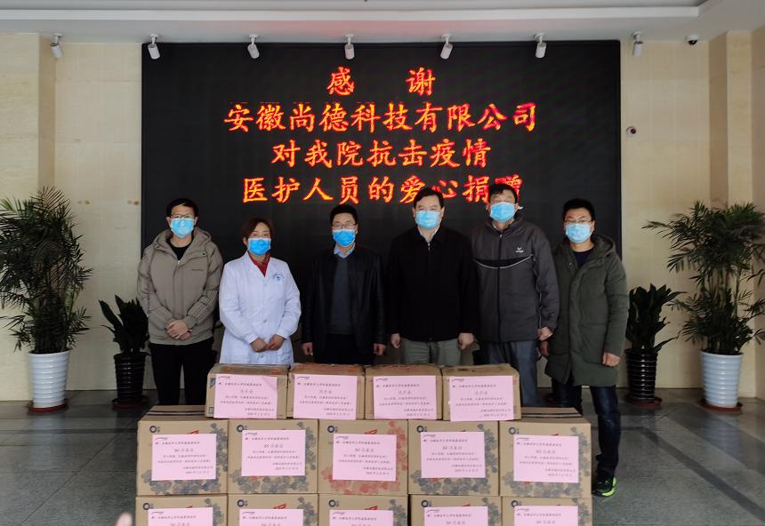 2月19日上午,安徽尚德科技有限公司吳世??偨浝泶砩械录瘓F將捐贈的防疫物資10箱消毒液、4箱洗手液送到安徽醫(yī)科大學附屬巢湖醫(yī)院,向奮戰(zhàn)在防控一線的醫(yī)護人員表達敬意。安徽醫(yī)科大學附屬巢湖醫(yī)院黨委工作部譚瓊主任、物資設備科東風主任代表醫(yī)院接收捐贈的物資。他們感謝尚德集團的愛心和善舉,表示社會各界的支持讓全院醫(yī)護人員士氣倍增,更有信心和力量打贏疫情防控阻擊戰(zhàn)。出席捐贈交接儀式的安巢經開區(qū)經貿局周毅局長對尚德善舉表示高度肯定。